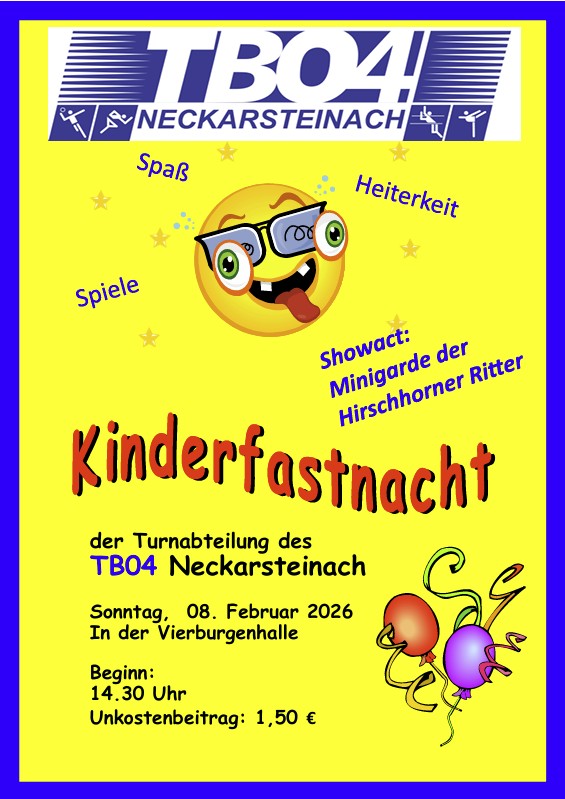 | So. 23.02.2025 | TB04 - Kinderfasching der Abteilung Turnen, 14:30 Uhr, Vierburgenhalle - [Einladung-Kinderfastnacht] - [Bericht-Kinderfastnacht-2025] |