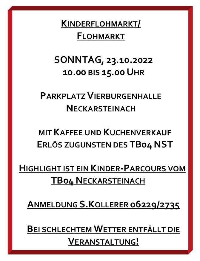 Am vergangenen Sonntag, den 23. Oktober 2022 fand auf dem Parkplatz der Vierburgenhalle in Neckarsteinach ein Flohmarkt statt. An verschiedenen Verkaufsständen konnten Kleider, Spielzeuge, Fahrräder und vieles mehr gekauft werden. Um die Sonne zu genießen, gab es Kaffee und Kuchen.