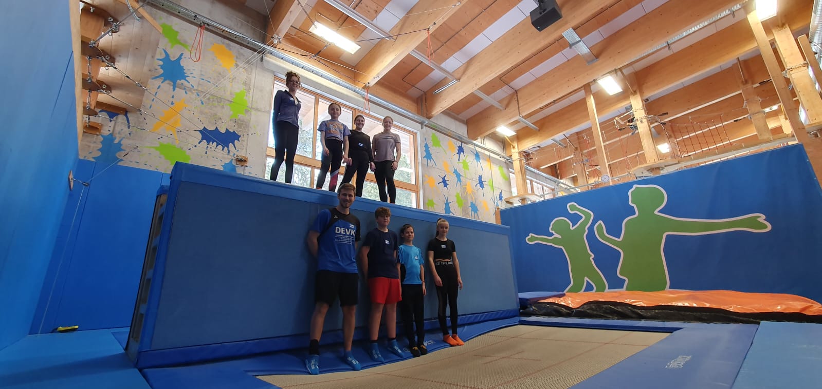 Samstag-Morgen haben wir uns pünktlich um 8 Uhr zum Frühstück getroffen, da wir bereits um 10 Uhr in der Fundorena, einer Indoor-Sporthalle mit verschiedenen Erlebnismöglichkeiten, sein wollten. Den Weg zur Fundorena haben wir mit einer kleinen Schneewanderung verbunden. Zuerst besuchten wir den Freestyle-Jump der Fundorena, von großen Trampolinen konnte man hier auf ein weiches Luftkissen springen und verschiedene Tricks probieren. Anschließend ging es in den Trampolinpark, ein Bereich, der ausschließlich aus Trampolinen besteht. Zum Abschluss sind wir noch in den Hochseilgarten, dort sind wir über den anderen Attraktionen geklettert, überwiegend meisterten wir alle Schwierigkeitsstufen!